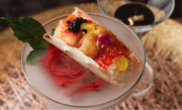 - Cuộn Wagyu mềm tan, béo ngậy, ôm trọn vị ngọt mặn tinh tế của nhum biển tươi. Sự hòa quyện giữa thịt bò thượng hạng và hương vị đại dương tạo nên trải nghiệm đậm đà và khó quên.